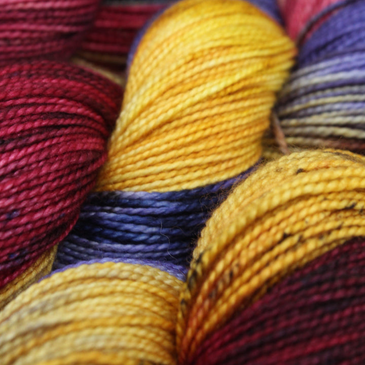 A gorgeous high twist silk merino blend with a pearly texture. The yarn is super soft and shiny. The fabric has a soft shine and a lovely drape. It is perfect for accessories and garments. The high twist construction means high stitch definition and shows off colour wonderfully. With a tight gauge and the strength of silk, this yarn could also be considered for socks.