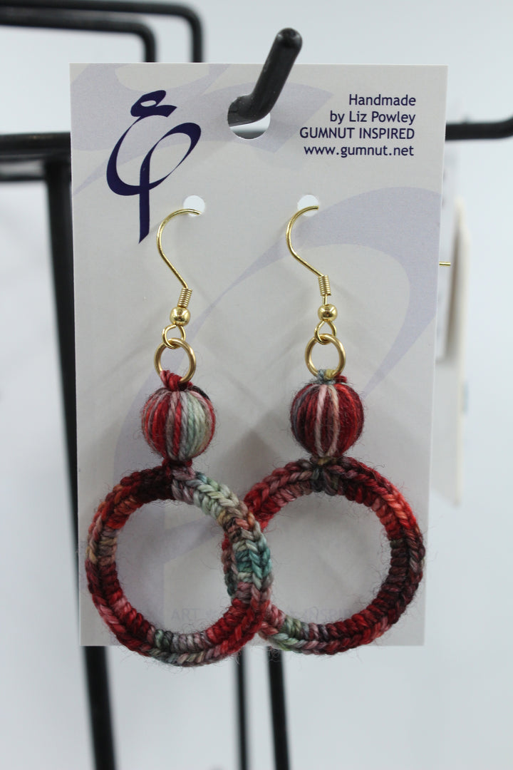 These earrings are made by Liz from Gumnut Inspired (local artist). They are made with yarn from the Skein Machine store.