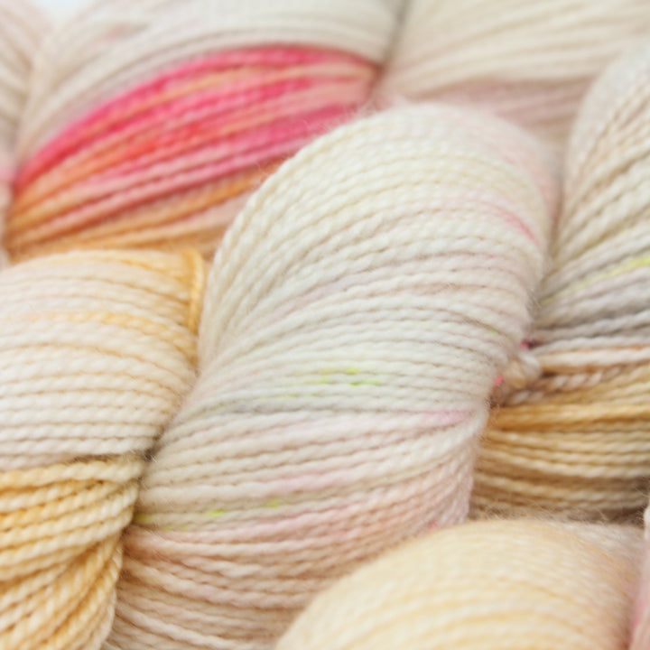 A gorgeous high twist silk merino blend with a pearly texture. The yarn is super soft and shiny. The fabric has a soft shine and a lovely drape. It is perfect for accessories and garments. The high twist construction means high stitch definition and shows off colour wonderfully. With a tight gauge and the strength of silk, this yarn could also be considered for socks.