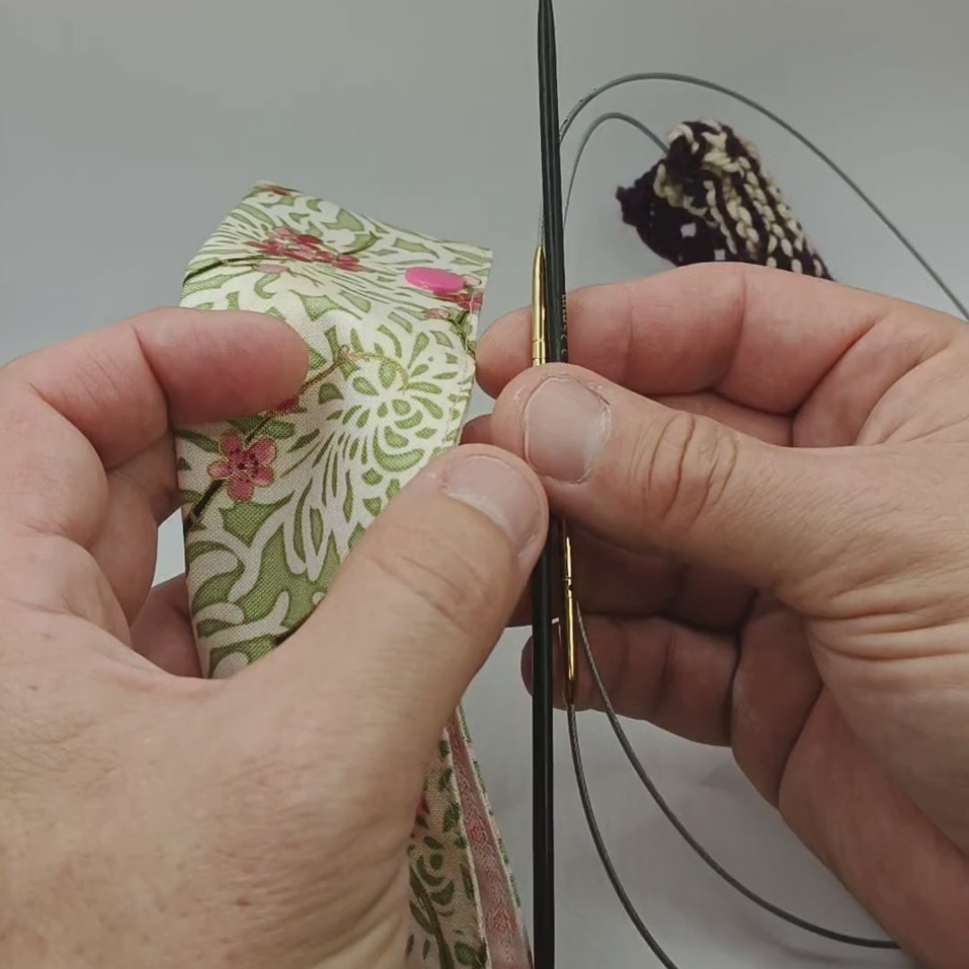 Handmade by Lorraine, This Needle Cosy is a great way to secure your knitting and keep your circular knitting needle/cables secure and compact when transporting. You can confidently place your projects into a knitting bag and know when you pull them out later they wont be tangled.