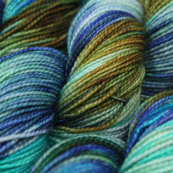 A gorgeous high twist silk merino blend with a pearly texture. The yarn is super soft and shiny. The fabric has a soft shine and a lovely drape. It is perfect for accessories and garments. The high twist construction means high stitch definition and shows off colour wonderfully. With a tight gauge and the strength of silk, this yarn could also be considered for socks.