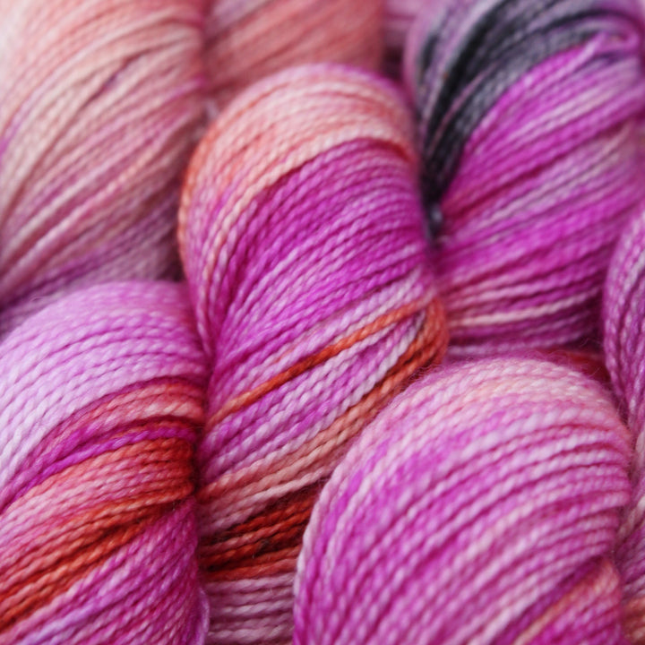 A gorgeous high twist silk merino blend with a pearly texture. The yarn is super soft and shiny. The fabric has a soft shine and a lovely drape. It is perfect for accessories and garments. The high twist construction means high stitch definition and shows off colour wonderfully. With a tight gauge and the strength of silk, this yarn could also be considered for socks.