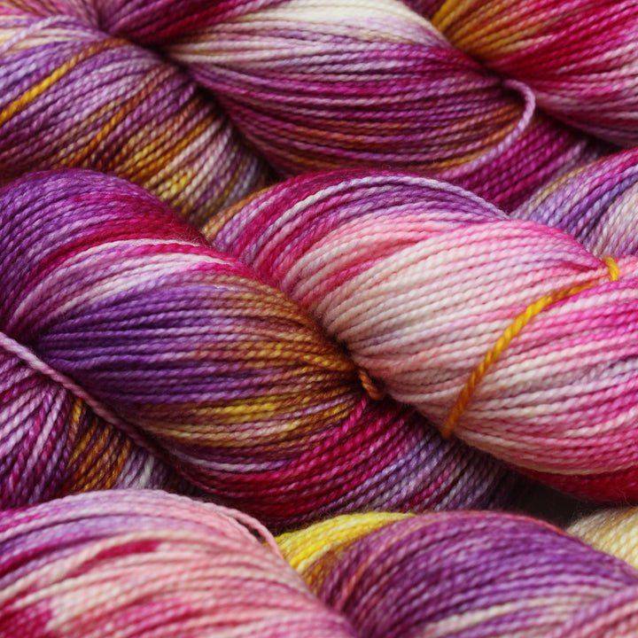 A gorgeous high twist silk merino blend with a pearly texture. The yarn is super soft and shiny. The fabric has a soft shine and a lovely drape. It is perfect for accessories and garments. The high twist construction means high stitch definition and shows off colour wonderfully. With a tight gauge and the strength of silk, this yarn could also be considered for socks.